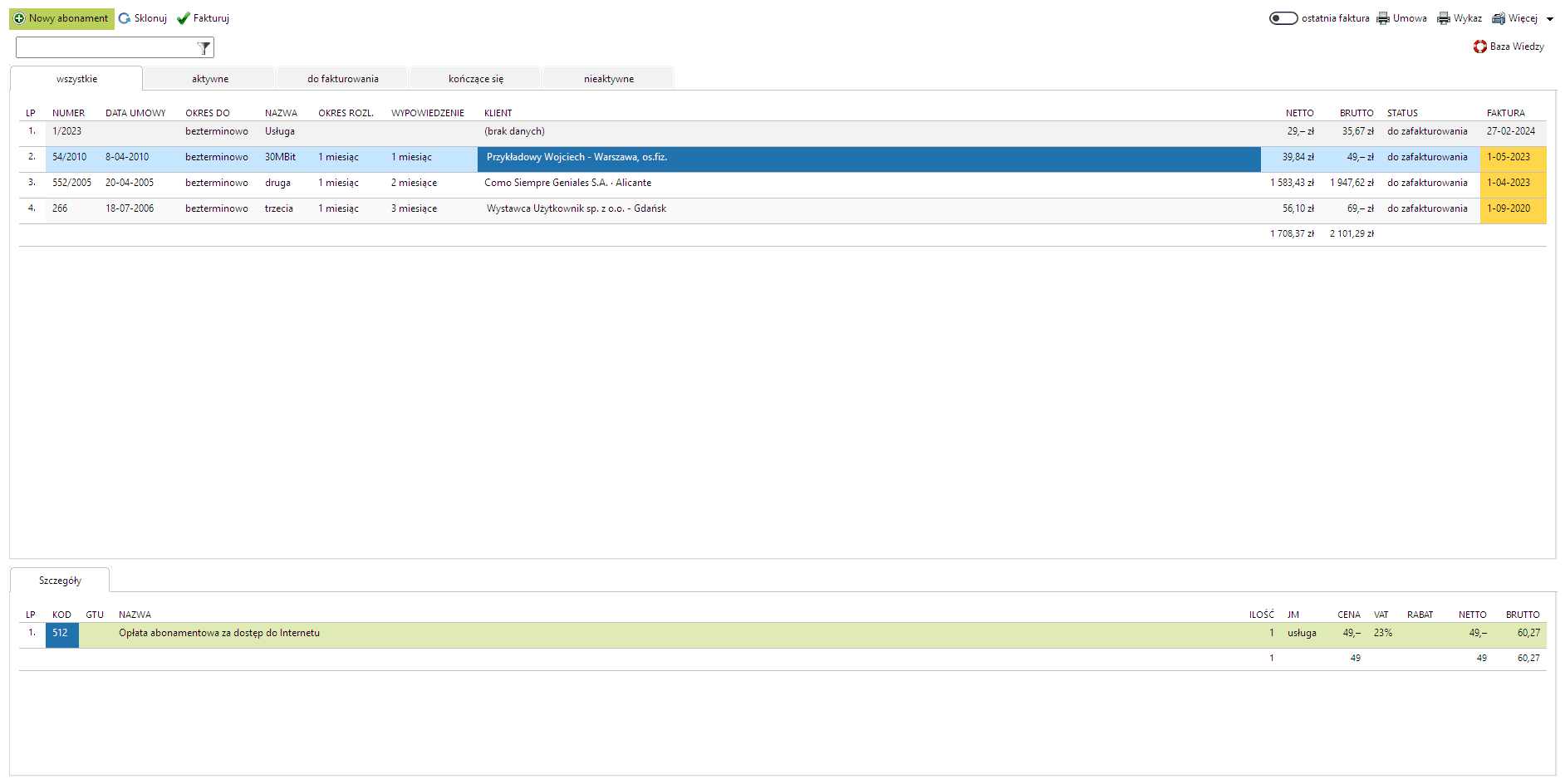 Fakturowanie seryjne i masowe na bazie wzorca. Wystarczy raz przygotować wzorzec umowy.Moduł Abonamenty jest dostępny w menu Usługi.