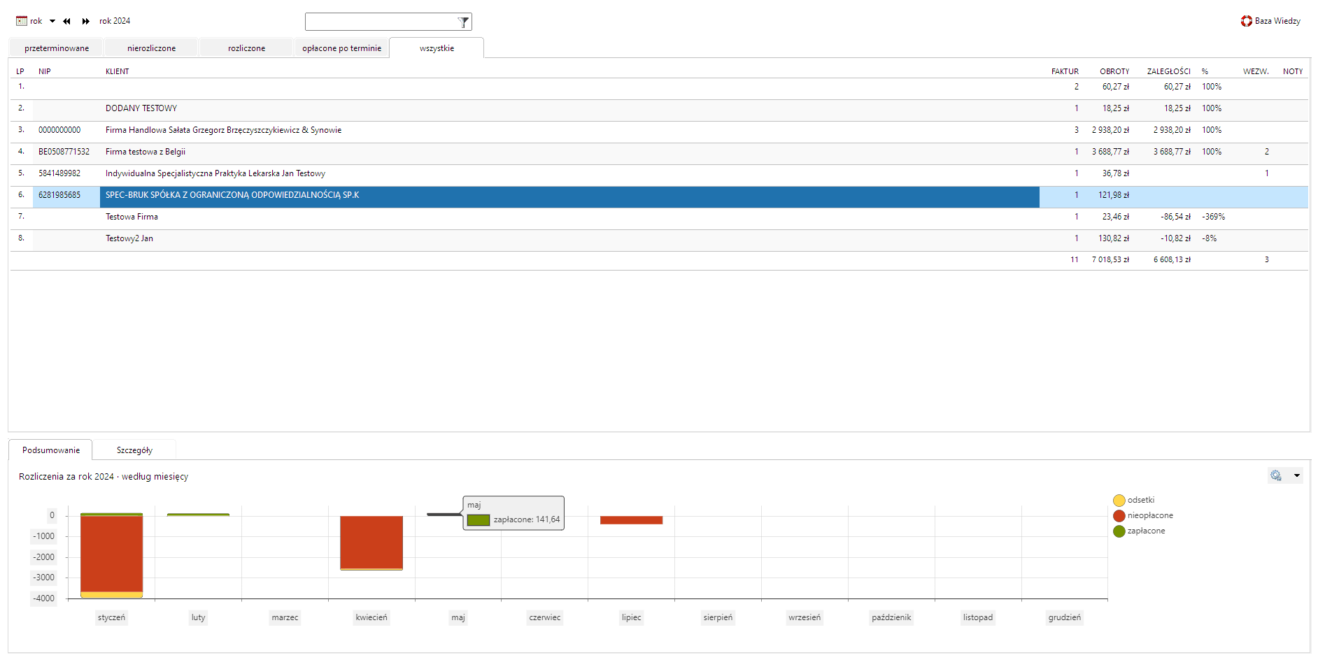 Rozliczenia z kontrahentami i windykacja. Automatyczne obliczanie salda rozliczeń każdego kontrahenta. Generowanie zbiorczych not odsetkowych i wezwań do zapłaty.