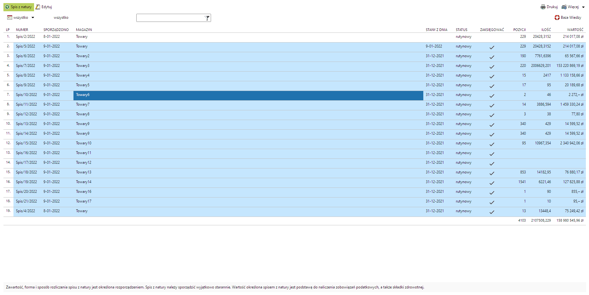 Podatkowy spis z natury. Remanent w wariancie podatkowym, wymagany przy rozliczeniu rocznym lub na żądanie urzędu skarbowego. Rozliczanie spisu, zbiorcze przeceny i weryfikacja danych.Moduł Spis z natury jest dostępny w menu Księgowanie.