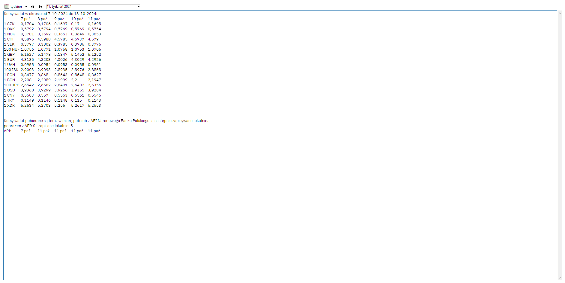 Kursy walut z tabeli NBP. Pobieranie kursów walut z dedykowanego API. Kursy są następnie przechowywane lokalnie, dzięki czemu dostęp do nich jest bardzo szybki.