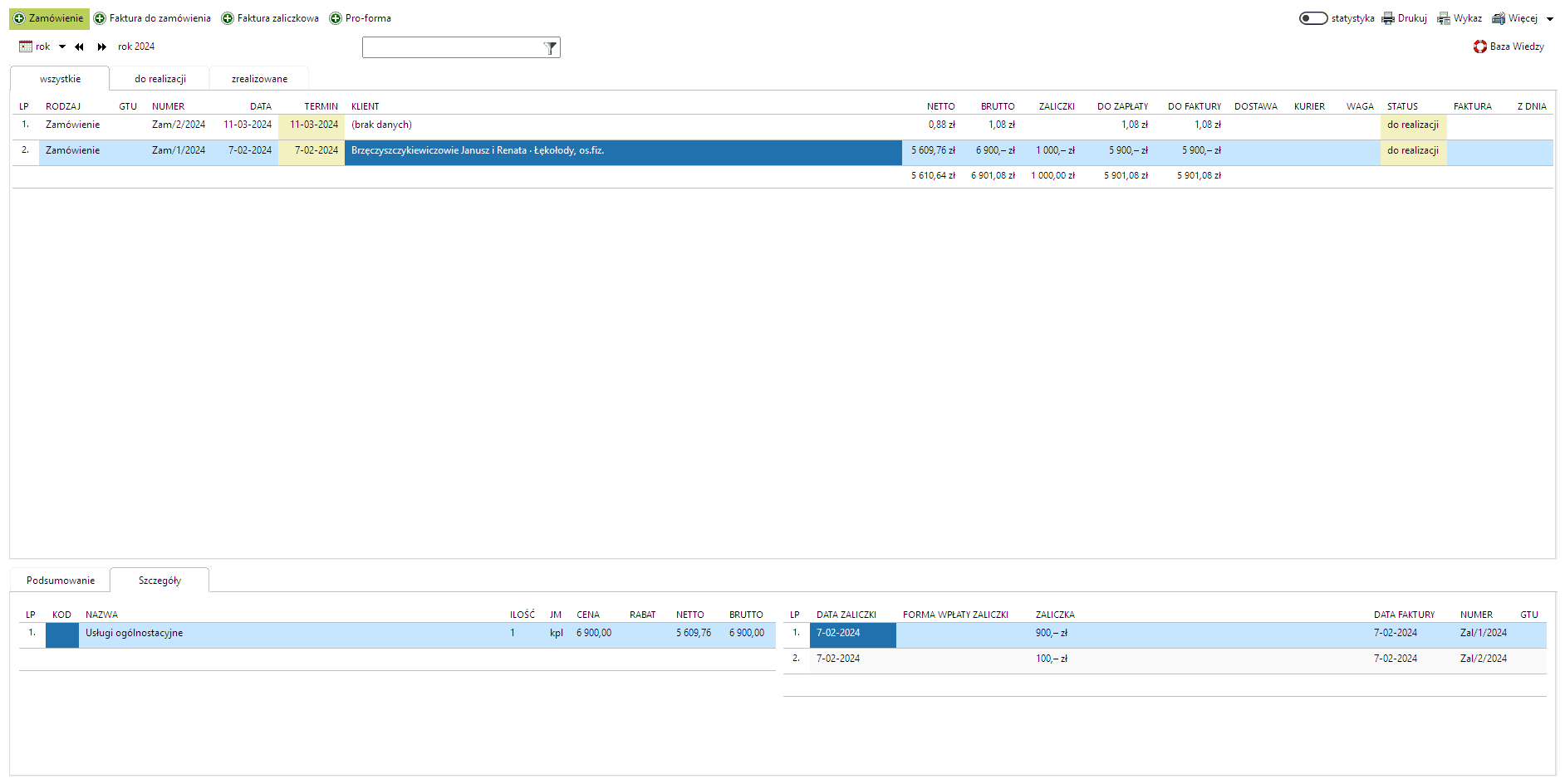 Zamówienie: Edycja zamówienia. Szczegóły zamówienia i jego rozliczenie. Dane kontrahenta, dane towaru lub usługi, wycena zamówienia. Rejestr zaliczek do zamówienia.